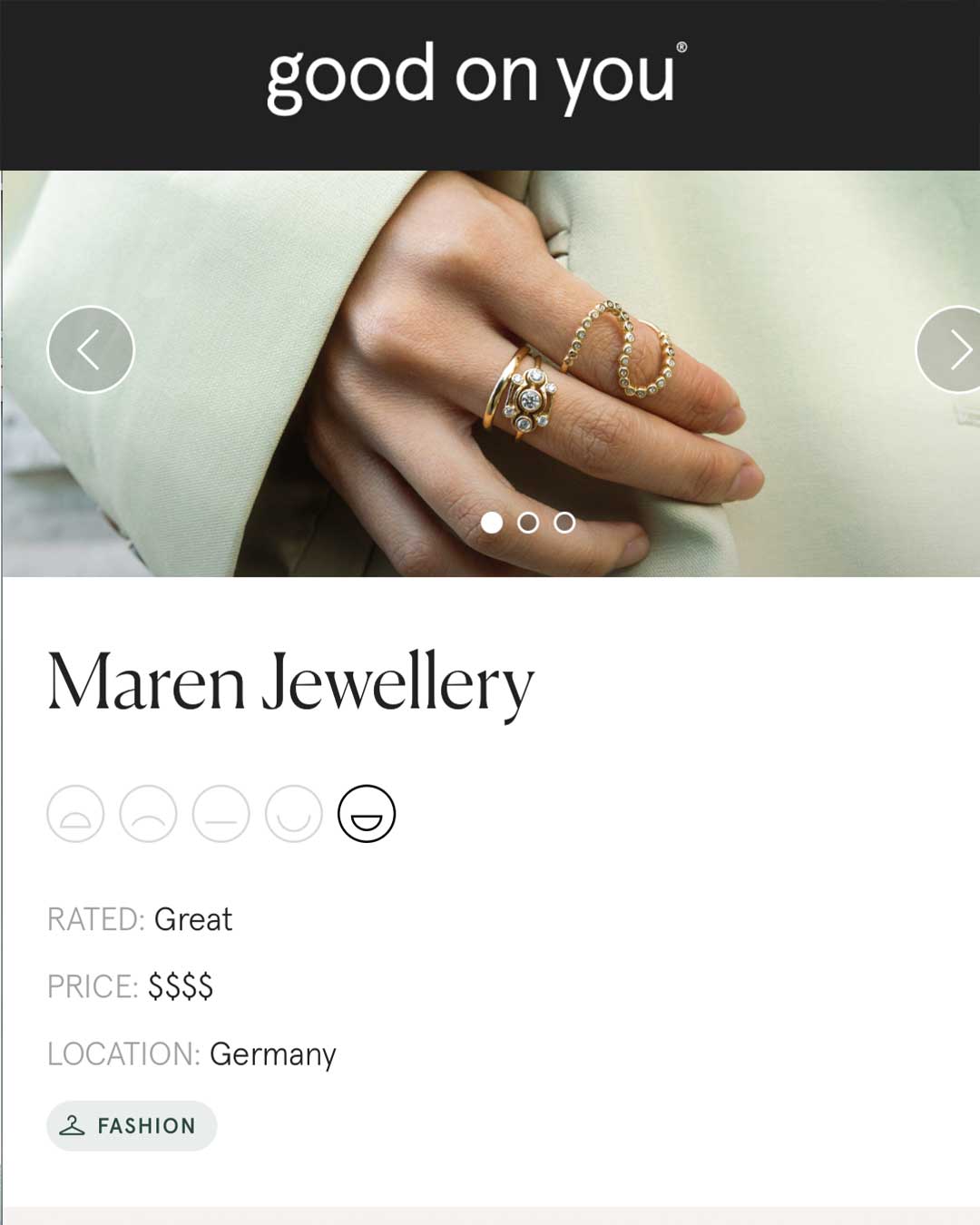 Wir haben wunderbaren Grund zur Freude: Maren Jewellery wurde von GOOD ON YOU mit der Bewertung „Great“ ausgezeichnet, der höchsten Bewertung, die die international anerkannte Nachhaltigkeitsplattform vergibt. Für uns ist das ein bedeutender Meilenstein, denn diese Auszeichnung bestätigt unsere kontinuierlichen Bemühungen um verantwortungsvollen, fairen und nachhaltigen Schmuck, transparent geprüft durch eine unabhängige Instanz.