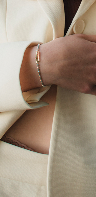 Bicolor kann auffällig oder subtil und zeitlos getragen werden. Für einen eleganten subtilen Look starte mit feinen Armbändern, Ketten oder Ringen und kombiniere die zu Deinem Hautton passende Metallfarbe mit ein paar Akzenten in einem andern Metall Ton. Am wichtigsten ist, dass Du Dich ausprobierst und so den Mix findest, der am besten zu Dir passt und mit dem Du Dich am wohlsten fühlst. Wenn Du noch ganz am Anfang im Ausprobieren des Bicolor Looks bist, empfehlen wir Dir unsere Milkyway Armband und unsere Milkyway Kette – jeweils in Silber mit goldenem Verschluss.