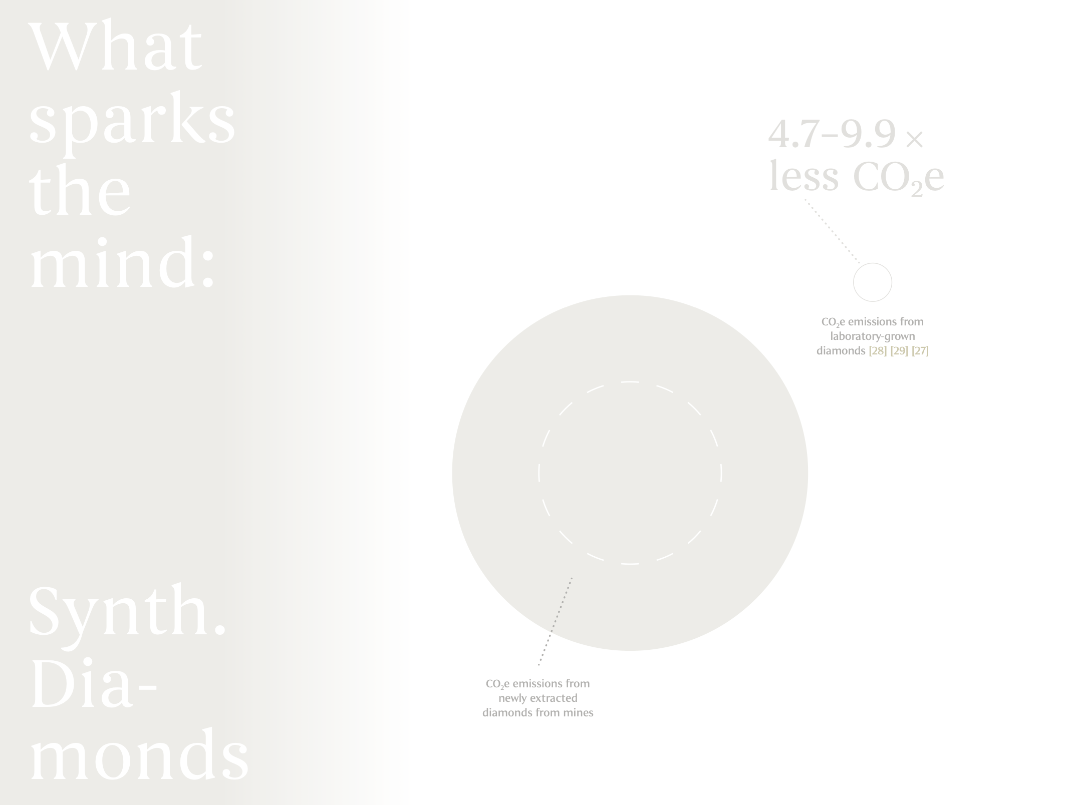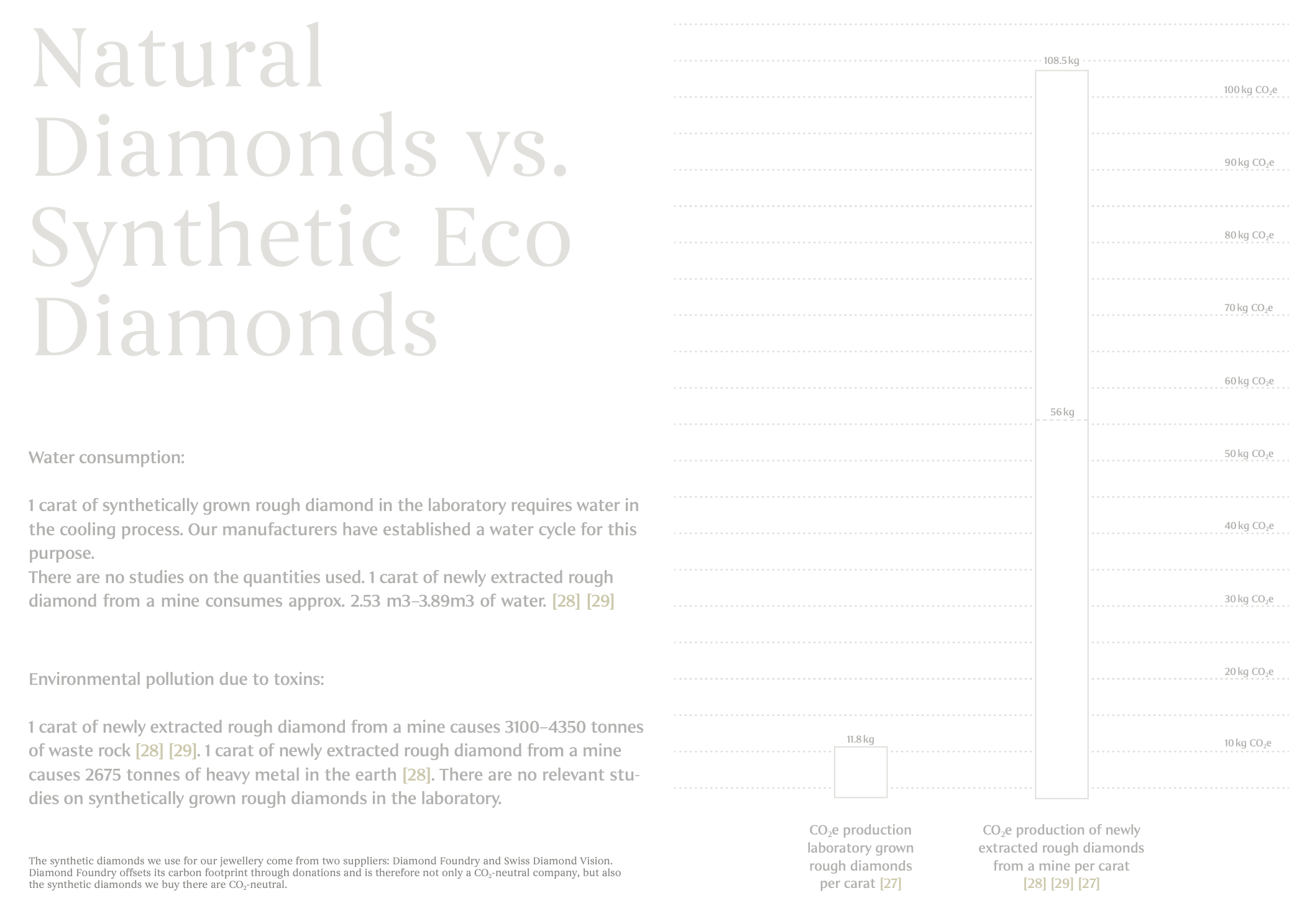 Not only are they just as pure and... unique like natural diamonds, but their origin is 100% assured: Our diamonds come either from Switzerland, India or America. Our gemstones are 100% from conflict-free origin. Synthetic diamonds are also resource-saving. If 1ct diamond is mined in the traditional way, up to 200 tons of earth have to be moved. Moving these masses requires an incredible amount of energy. Our diamonds are therefore much more environmentally friendly than natural diamonds. The high energy required for the breeding process alone is problematic, but this is also taken into account at Diamond Foundry and Fenix Diamonds, which, like Maren Jewellery, are CO2 neutral companies..