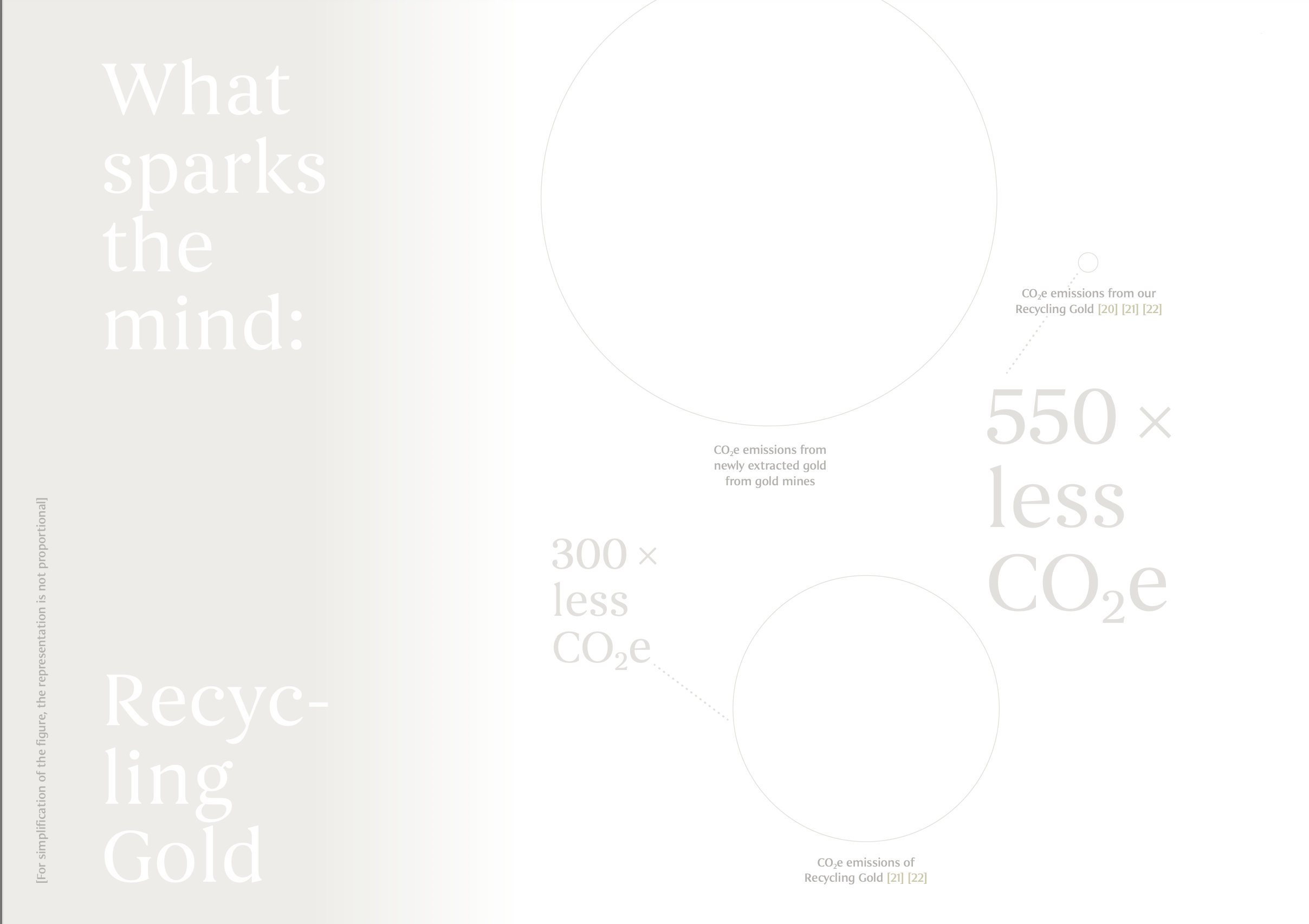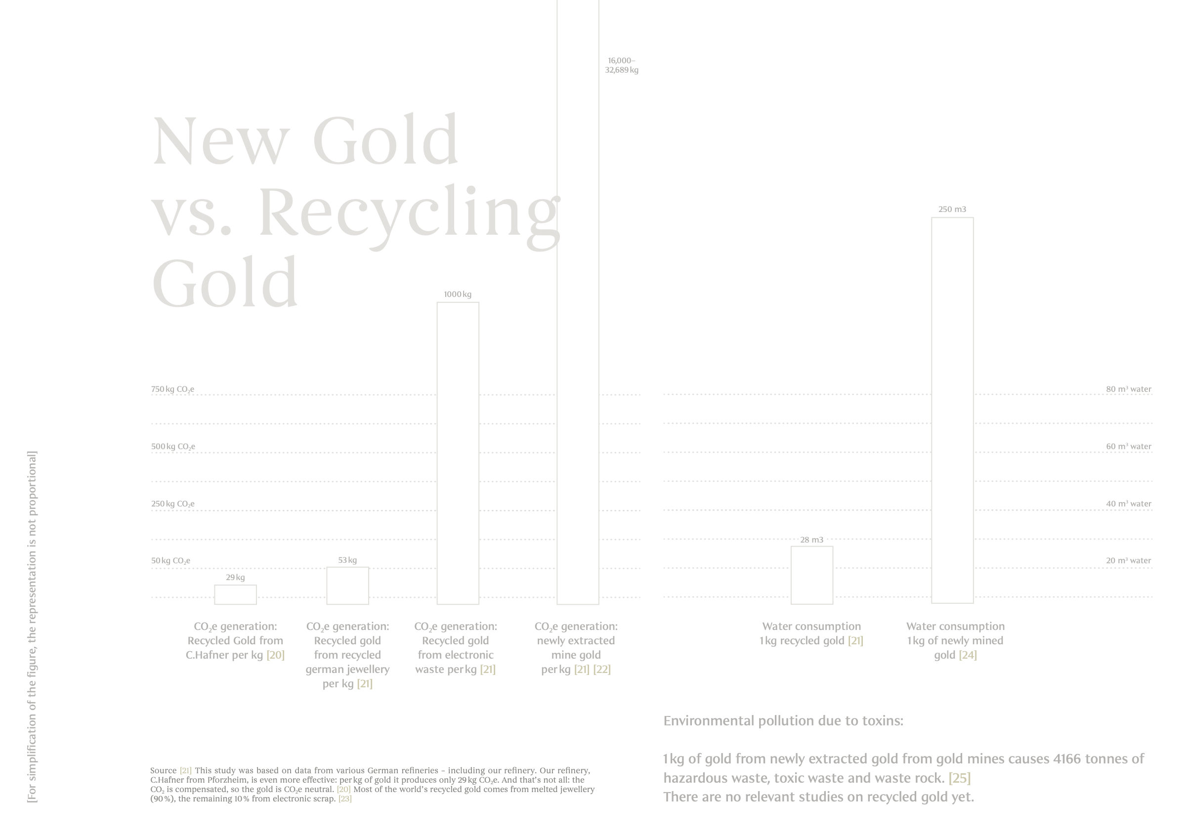 Creating the amount of gold needed to make a single ring creates up to 20 tons of waste. And especially in small-scale mining, which accounts for about 15% of the newly mined gold, people who often have no other means of income put their lives in danger every day due to lack of equipment and disturbingly bad working conditions in order to get a raw material from the depths of the earth to transport, the beauty of which they very probably can no longer even perceive.