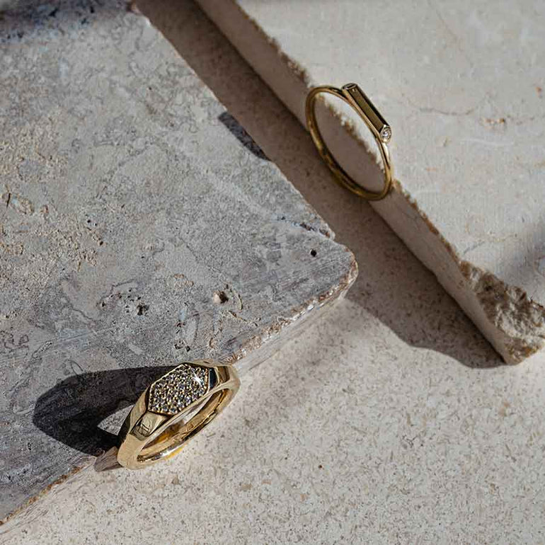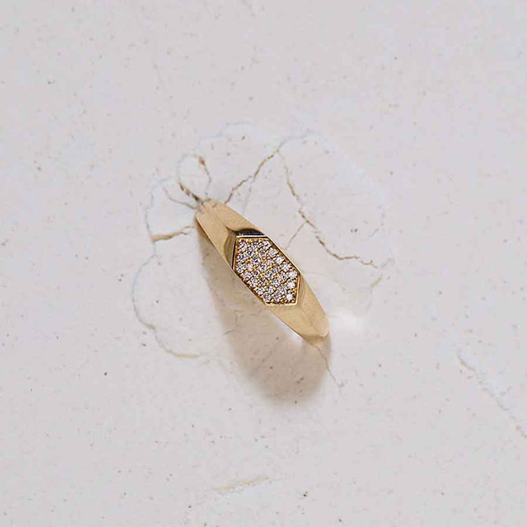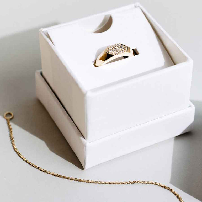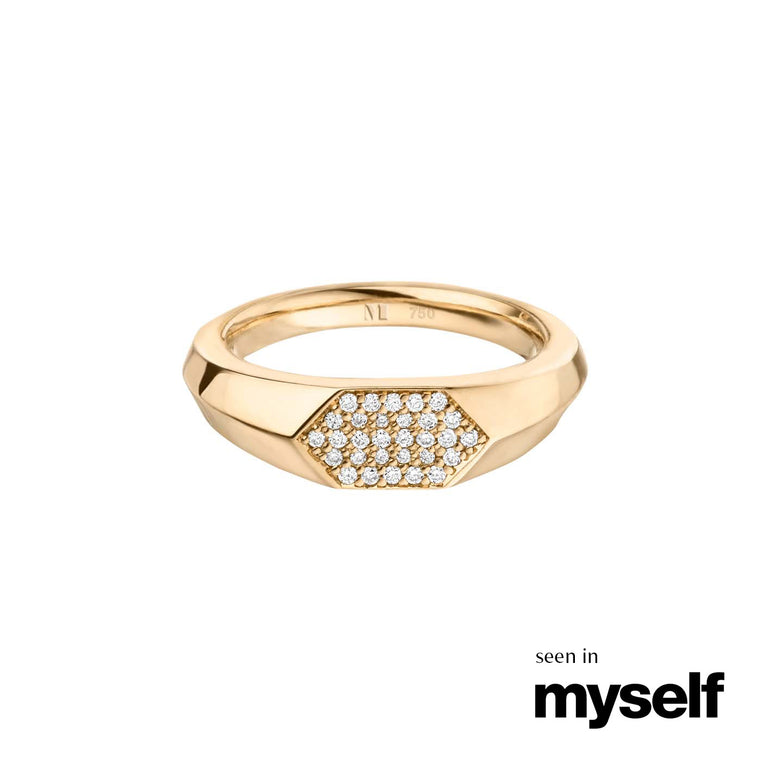 The beautiful Sunray Signet ring from the Sunray collection, handcrafted in Germany, is made of German recycled 18 carat gold and is set with 30 hand-set lab diamonds. Like the sparkle of the sun, this ring impresses with its clear beauty and its impressive play with light. Wear the light of the sun on your finger with our timeless Sunray Signet Ring!