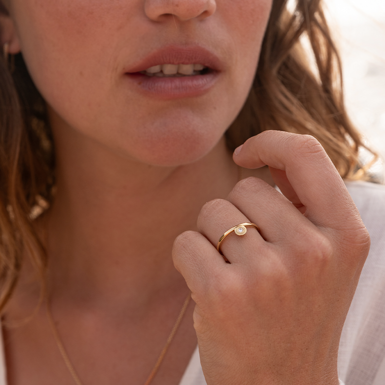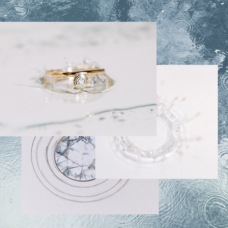 The beautiful Drops of Memories ring from the Memories of the Sea collection, handmade in Germany, is made of German recycled 18 carat gold and is set with a lab diamond. Love and the sea - both are always in motion, cannot be tamed once they develop their power, they are both so deep, seemingly infinite. Choose a sign of your love that is as deep as the sea - choose our Drops of Memories Ring.