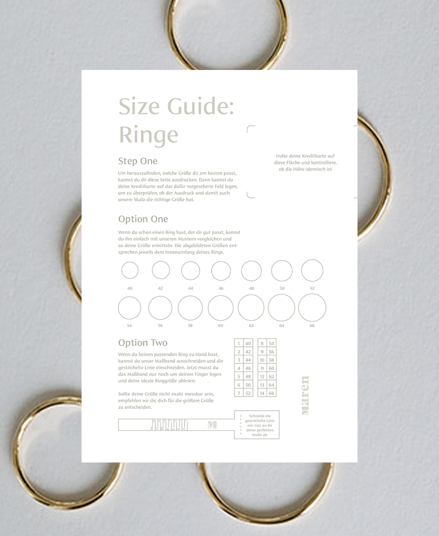 Wenn Du Deine Ringgröße von uns anpassen lässt, sollte diese danach auch perfekt sein. Um Deine individuelle Ringgröße zu bestimmen, haben wir unseren Size Guide entwickelt. Diesen kannst Du ganz einfach herunterladen und ausdrucken. Entweder nimmst Du einen Deiner vorhandenen Ringe als Maßstab und liest Deine Ringgröße ganz einfach ab, oder aber Du verwendest das Maßband unseres Size Guides, legst es um den gewünschten Finger und ermittelst auf diese Weise Deine ideale Ringgröße.